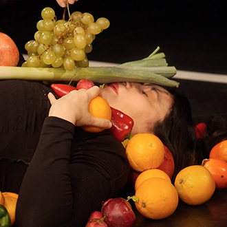 Eine Vielzahl unterschiedlicher Früchte und Gemüsesorten bevölkert das Video, jede begleitet von ihrem eigenen Klang: das tiefe, dröhnende Vibrieren von Frühlingszwiebeln, das schnelle „plopplopplop“ der Blaubeeren und das größere, langsamere „plop plop plop“ der Trauben. Indem sie den Dingen, die wir essen, eine Stimme verleiht, reagiert Ekici mit einem zutiefst menschlichen Spieltrieb auf Nahrung: Sie fragt uns, „Was würden diese Früchte tun, wenn sie handeln könnten? Was würden diese Gemüse sagen, wenn sie singen könnten?“ Sie verstärkt diesen Sinn für Humor und Satire, indem sie das, wovon wir abhängig sind, vermenschlicht: die Dinge, die uns jene Nährstoffe liefern, von denen unser Leben abhängt.