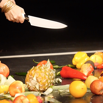 Obst, Gemüse, Messer, weißes Klebeband, Kostüm, Theater-Spots, Mikrofon