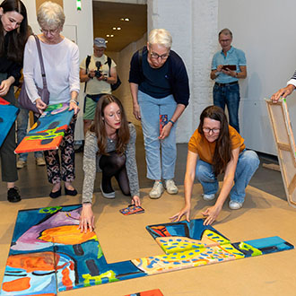 Ekici´s Performance beginnt im 1 Stock der Kunsthalle. Zusammen mit den Gästen puzzelt sie ihr Kunstwerk „Searching Another“ zusammen. Im Anschluß begrüßt sie die Gäste mit einem türkischen Ritual, „Kolanya ve Lokum“ (Parfum und Turkisch Delight).
