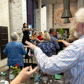 Es wird gemeinsam gegessen, getrunken und unterhalten. Ekici performt zwischen den Gängen interaktiv mit den Gästen Performance-Fragmente aus ihren Arbeiten mit Bezug zum Gemälfe, wie „Imagine“ (2012 - Flamenco Tanz mit Apfel) und „Crema“ (2001 - Schalgsahne zu Butter schlagen mit der Hand als Mixer).