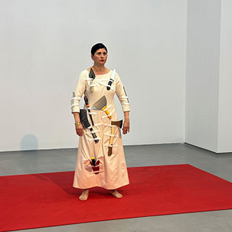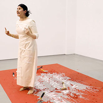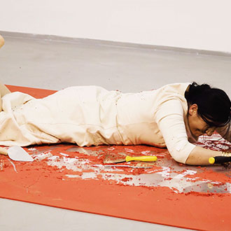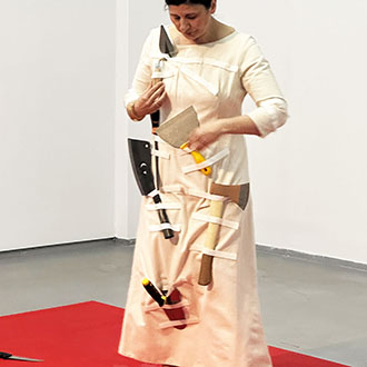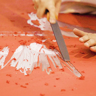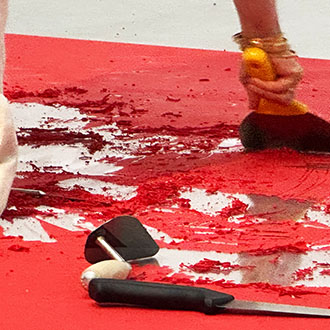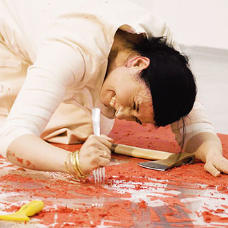 Die Künstlerin trägt ein Kostüm, das mit vielen scharfen Gegenständen wie Messern, einer Axt, einem Schaber etc. ausgestattet ist. Sie verteilt diese Utensilien auf der roten Oberfläche und beginnt, die rote Farbe abzukratzen. Je mehr sie kratzt, desto mehr sieht man die darunterliegende transparente Plexiglasplatte und die Schrift die unter dem Plexiglas am Boden installiert ist, Das laute Kratzen übt eine Kraft auf das Plexiglas und das Publikum aus.
