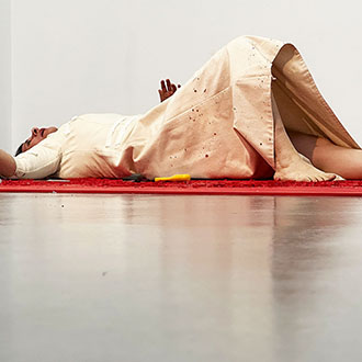 Die Künstlerin steht auf einer roten, transparenten Plexiglasplatte. Unter dem transparenten Plexiglas werden langsam Buchstaben sichtbar, bis ein Satz erkennbar wird.