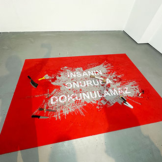 Die Betrachter können den Schriftzug in türkischer Sprache lesen: “INSANIN ONURUNA DOKUNULAMAZ“, der inhaltlich Artikel 1 des deutschen Grundgesetzes entspricht: „Die Würde des Menschen ist Unantastbar“.