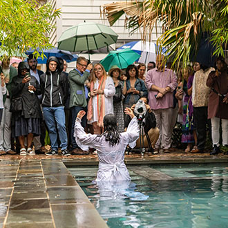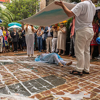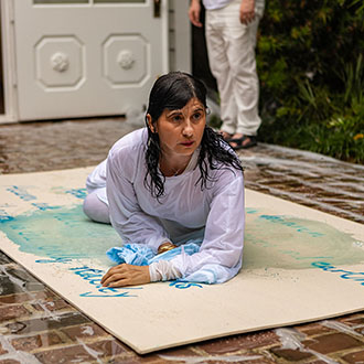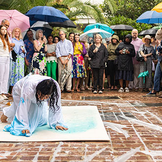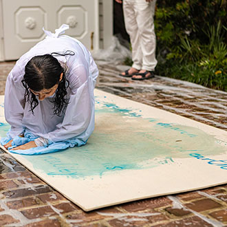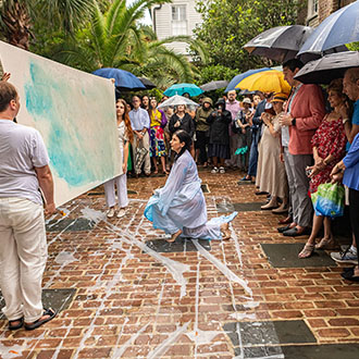 Bei der FSA Inspired Garden Party wird die Premiere von Ekicis Live-Performance "Piece / Peace of Heaven" gezeigt, die über Charlestons sakrale Außenräume und die Beziehung zwischen religiöser Architektur und dem Himmel reflektiert. Inspiriert von der spirituellen Landschaft der „Heiligen Stadt Charleston“, die Kirchen, Synagogen, Tempel und Moscheen umfasst, meditiert Ekici über die Glaubenspraktiken verschiedener Religionen unter einem gemeinsamen Himmel. Sie schreibt religiöse Texte auf die Leinwand in Himmel-Blau (Haint-Blue), einer Farbe mit besonderer regionaler Bedeutung. Ekici integriert das Element Wasser, um eine Ablution – Wasserreinigungs- und Reinigungsrituale wie Taufe, Mikvah und Wudu – zu symbolisieren. Ekici stellt sich in "Piece / Peace of Heaven" die Nähe des Himmels zur Erde vor und erforscht, was es bedeuten könnte, mit dem Himmel in Kontakt zu treten und eins zu werden.