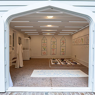 Im Open Studio waren zwei Performance-Werke von Nezaket Ekici aus ihrer Residenz in Charleston im Entstehungsprozess zu sehen. "Feeling Stained Glass" lässt sich von der spirituellen Atmosphäre und dem architektonischen Erbe der Grace Church Cathedral inspirieren, insbesondere von ihren Buntglasfenstern und kunstvollen Nadelspitz-Kniebänken. Ekici schuf "Fenster" aus Klebeband an den Studiowänden und stellte die Buntglasfenster als zweidimensionale Bodengrafik mit Fotografien und realen Objekten neu dar. Ihre Live-Performance in der Grace Church Cathedral am 5. Mai 2024 war ein meditativer, ortsspezifischer Beitrag mit der Opernsängerin Hälis Rünk, der visuelle Kunst und Musik miteinander verschmelzen ließ, um interreligiöse ästhetische Traditionen aus christlicher, islamischer und jüdischer Mystik sowie dem Zen-Buddhismus zu vereinen. Im Studio sind auch ihre selbstgemachten Kostüme und die Performancedokumentation zu sehen, die auf denselben Stoff projiziert wird, der im Studiokleiderschrank verwendet wurde und einen Beichtstuhl nachahmt.