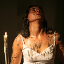 Die Fotoarbeit bezieht sich auf die gleichnamige Perfomance, in der die Künstlerin auf einem Podest steht und über Ihr angebrachte Kerzen entzündet. Die Kerzen hängen falsch herum, weshalb das heiße Wachs auf sie heruntertropft.