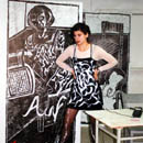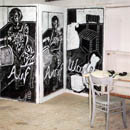 Linoldrucke auf Format: 3x2 m; Tisch und Stuhl, Telefon