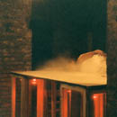 Baby Puder, Weißes Gewand, Objekt (Holzkonstruktion, mit roten Lampen), Licht