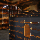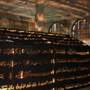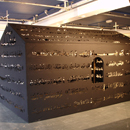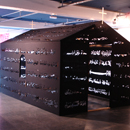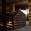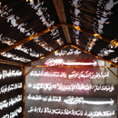 Gerüst aus Holz, Spot light, Schwarzer Stoff mit ausgestanzten Lettern der Gebetssuren des Koran.
