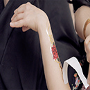 Die Künstlerin durchlebt hier in einer Art Traumszene erneut eine Kindheitserfahrung. Als Sie 7 war, gab es in ihrer Heimatstadt an jedem Kiosk künstliche Tatoos zu kaufen, die mit Spucke auf die Haut geklebt wurden und dort für einen oder zwei Tage blieben.