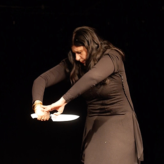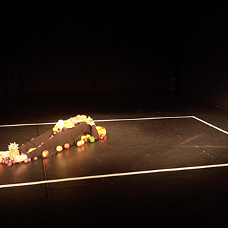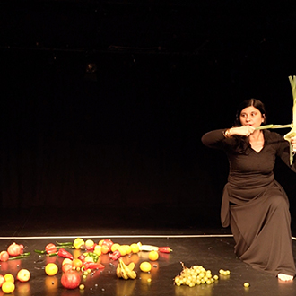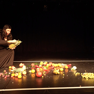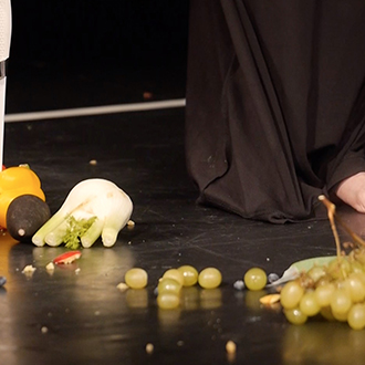 Ekici liegt auf einer schwarzen Bühne, um sie herum sind Dutzende von Obst- und Gemüsesorten verstreut. Einige liegen auf ihrem Körper, andere untätig neben ihr. Sie performt mit ihnen – singt, spielt, isst. In Colour of Sound begreift Ekici den Körper als offenes Feld ritueller Begierde und entdeckt in Obst und Gemüse eine Beziehung von Farbe und Klang, die zugleich satirisch und gefährlich, ungewöhnlich und schön ist. Ihre grundlegende Praxis ist eine Art visuell-auditiv-gustatorisches Gesamtkunstwerk – sie verknüpft die kollektive Schnittstelle unserer menschlichen Sinne als einen Raum, in dem Farbe, Klang und Geschmack voneinander abhängen und miteinander interagieren.