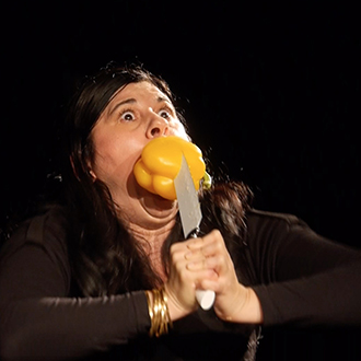 Obst, Gemüse, Messer, weißes Klebeband, Kostüm, Theater-Spots, Mikrofon