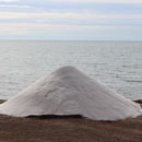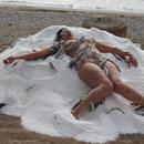 Viele Fische sind auf den Körper der Künstlerin montiert, von Kopf bis Fuß und mit einem feinen Nylonfaden angebracht. Die Künstlerin trägt ein Fisch Kostüm und es scheint, als ob sie selbst ist ein Fisch wäre. Sie ghet langsam auf einem Berg von Salz zu, der am Meer aufgetürmt wurde.