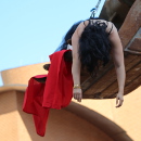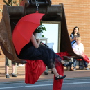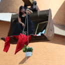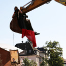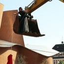 Nach und nach macht die Künstlerin es sich zusammen mit einer Pflanze, einem Bettlaken, einem Kissen, einer Lampe, einem Regenschirm und weiteren Gegenständen in der Schaufel gemütlich. Sie zieht die Objekte jeweils an einem Seil einzeln nach oben, nachdem eine Assistentin am Boden diese vorab festgeschnürt hat.