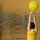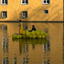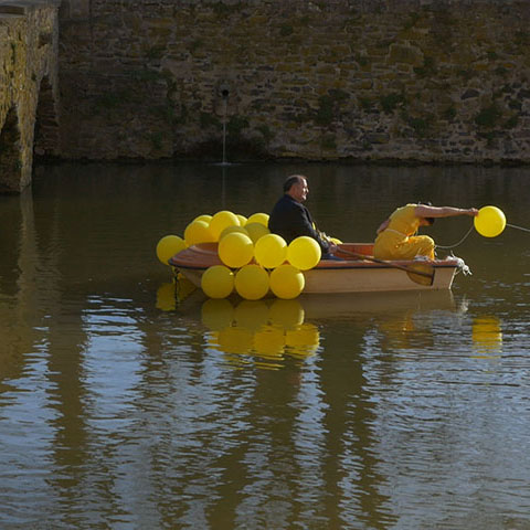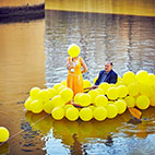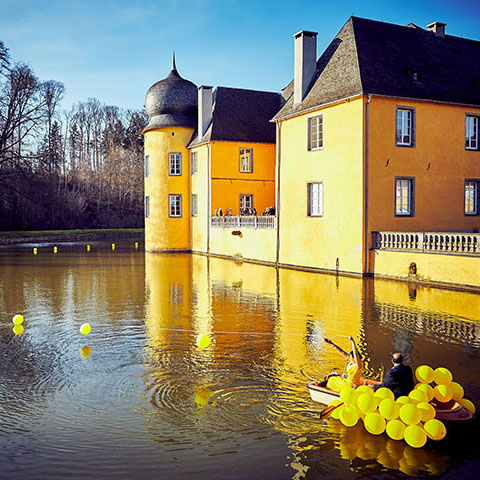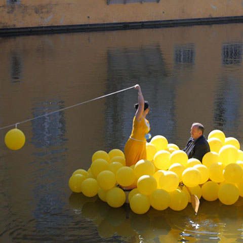 Die Künstlerin befindet sich auf der Wasseranlage des Burg Gudenau auf einem Ruderboot, um sie herum befinden sich zahlreiche gelbfarbene Ballons und ein Bootsfahrer.