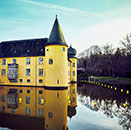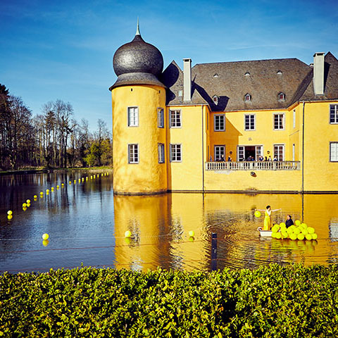 Von mehreren Stelle rund um das Schloß herum ergeben sich neue Perspektiven und zeigen das Schloß und den Wassergraben als eine performative Wasser-Skulptur, die eine Verbindung zu der Architektur des Wasserschlosses in Form und Farbe aufbaut.