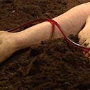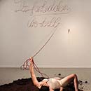 Die Künstlerin nimmt das Schlauchende des Satzes von der Wand in den Mund und legt sich auf den Erdhaufen. Dann beginnt sie langsam zu saugen, je mehr sie trinkt, desto weniger rote Flüssigkeit verbleibt im Schlauch. Die rote Flüssigkeit symbolisiert nach dem Bibelwort die Teilhabe an Gott: „… nehmet und esset alle davon. … dieser Wein ist das Blut Christi“ - und steht somit hier für das Leben. Je länger die Performance andauert, desto weniger „Blut“ und damit Leben verbleibt im Schlauch. Durch die anstrengende Tätigkeit wird der Atem der Künstlerin schwerer. Mit jedem Atemzug bewegt sich die Flüssigkeit im Schlauch auf und ab. Die Künstlerin liegt auf dem Erdhaufen, mal ist sie unter der Erde, mal sieht man Körperteile, dann steigt sie aus dem Erdhaufen auf, von Erde bedeckt.