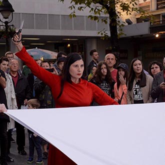 Die Performance „Hatchet“ fand erstmals in der Fußgänger-Zone in Belgrad statt.