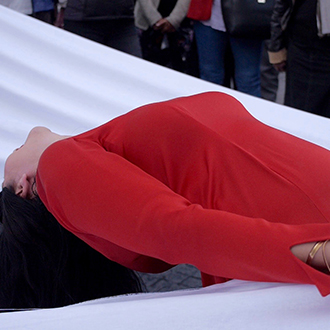 Die Performerin Nezaket Ekici bewegt sich mit 16 weiteren Performern in Richtung Fußgänger-Zone mit einem langen weißen Baumwollstoff. Der Stoff ist ca. 50 m lang und 2 m breit. Er wird von den Performern horizontal 1 m über dem Boden gehalten.