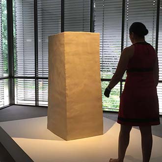 Die Installation ist mit Absicht zwischen zwei Fensterfronten des Museum im diagonal installiert, so dass bei jedem Schlag die Tonskulptur in die Ecke gedrängt erscheint.