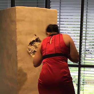Der Tonblock wird unter den Händen der Künstlerin zu einem Konsumenten, der die Schläge absorbiert ohne sich zu wehren und in plastischer Form wiedergibt, was ihm wiederfährt.
