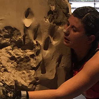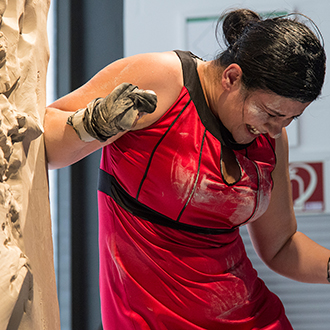 ?Sie beginnt mit ihren bloßen Fäusten auf den Ton zu schlagen wie eine Boxerin. Je häufiger Sie schlägt, umso mehr entstehen sichtbare tiefe Einbuchtungen. Über die Dauer benutzt sie ihren ganzen Körper wie Ellbogen, Knie, Füße und selbst den Kopf. Die glatte Oberfläche des Tons verändert sich und gleicht am Ende der Performance einer Mondlandschaft.