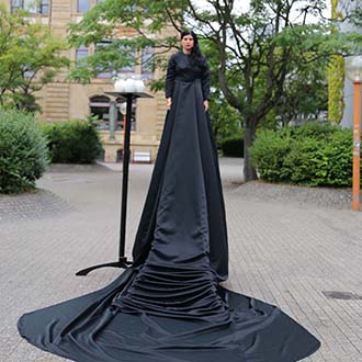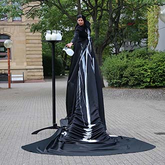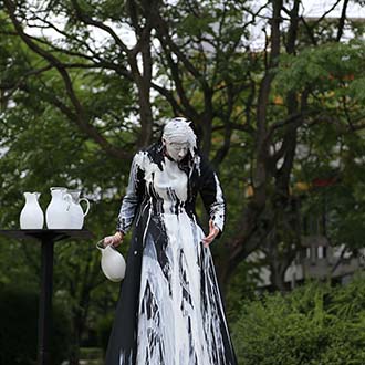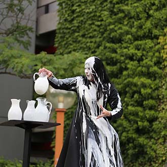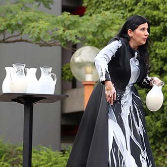 In der Performance steht die Künstlerin erhöht auf einem Sockel in einem langen schwarzen Kleid. Neben Ihr befinden sich mehrere Gefäße mit Milch.