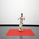 Die Künstlerin steht auf einer roten, transparenten Plexiglasplatte. Unter dem transparenten Plexiglas werden langsam Buchstaben sichtbar, bis ein Satz erkennbar wird.