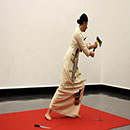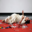 Die Künstlerin trägt ein Kostüm, das mit vielen scharfen Gegenständen wie Messern, einer Axt, einem Schaber etc. ausgestattet ist. Sie verteilt diese Utensilien auf der roten Oberfläche und beginnt, die rote Farbe abzuratzen.