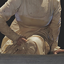 Sie taucht in den Brunnen ein und ist durchnässt von Kaffee. Sie steigt aus dem Brunnen langsam wieder hoch.