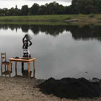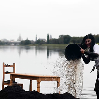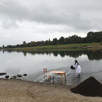 Ekici bezieht sich in ihrer Performance “HQ50” auf die Überschwemmung in Dresden. Ein Erdhaufen steht gleichermaßen für den Schlamm und die vielen Dämme. Ein Tisch  und ein Stuhl stehen für das Leben in Dresden und das echte Elbwasser wird einerseits zum reinigen genutzt, andererseits steht es aber auch die zerstörerische Kraft der Natur. In einem weißen Kostüm geht sie mit einem Eimer in die Elbe und füllt den Eimer mit Wasser, um ihn dann auf dem Erdhaufen auszuschütten. Den Schlamm schüttet Sie über Tisch und Stuhl und über sich. Wenn sie erneut Wasser aus der Elbe holt, reinigt sie sich und den Stuhl und den Tisch vom Schlamm. Immer wieder friert sie ihre Bewegungen ein und wird für kurze Zeit zu einer living Sculpture, die der Situation Andenken ist und zugleich Ausdruck.