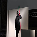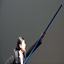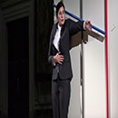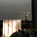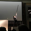 Die Performancekünstlerin nimmt einen langen Stab, positioniert sich auf dem Sockel vor der weißen Fläche wie eine lebendige Skulptur und erzählt über eine Figur im Original-Gemälde und deren Position im Werk. Danach geht sie zu der weißen Fläche und installiert den Stab. Dann nimmt sie neuen Stab, geht erneut auf den Sockel in neuer skulpturaler Haltung und erzählt von der nächsten Figur – gefolgt von der Installation des Stabes an der weißen Fläche.