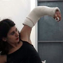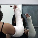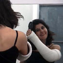Der Gips am Arm schränkt die Bewegungsfreiheit ein. Er symbolisiert die Behinderungen, die uns im alltäglichen Leben begegnen und die wir kompensieren müssen, wollen wir weiterhin lebenstauglich sein. Viele Bewegungen können mit den Gipsarmen nicht mehr oder nur auf anderen Wegen ausgeführt werden. Die verschiedenen Performances zu diesem Thema, wie "sich schminken", "spaghetti essen" und "Bauchtanz" zeigen die Schwierigkeiten auf, die mit dieser Behinderung verbunden sind. Der Gipsarm rückt bei allen Bewegungsabläufen in den Vordergrund. Er wird immer als Fremdkörper begriffen, an den sich der eigene Körper anpassen muß: Der Gips gibt dabei nur wenig nach oder er bricht. Der Fremdkörper "Gipsarm" wirkt während des Tanzens skuril. Der Bauchtanz, der als erotischer Tanz gilt, gerät durch die Gipsarme in einen aerotischen Zusammenhang. Obwohl eigentlich nur eine kleine Veränderung am Körper vorgenommen wurde, erweckt dies ein anderes Gesamt-Bild zum Leben, das dem Klischeeverständnis (in diesem Fall dem erotischen Bauchtanz) entgegen steht. Durch den Gips wird schmerzlich deutlich, wie abhängig der künstlerische Ausdruck von der Wahrnehmung ist. Bei der "Gypsum Make-up Performance" handelt es sich insgesamt gesehen um den Versuch, Schönheit auf anderen Wegen darzustellen.