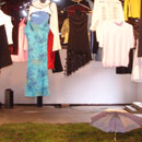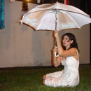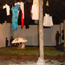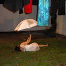 In the performance/Installation "Monsoon" Ekici takes relationship to the most common Asian Weather season and transforms it into art. Ekici wants to present the rain as a visual and asthetic impact. That's, why the arrangement of the Installation Performance resembles a dream situation. This performance deals with dreams, which is represented by a virtual rain. The sound of the rain is boosted y sound system and microphones. As the water drips down, it also hits the umbrella. Normally one can not hear the dripping water, dispite one stands very near to this place. The artist wants the viewer to become a part of this dream by involving him not only by means of visibility but also accustically. The dripping of water of wet clothes onto the umbrella, can be heard all aver the exhibition room. This scence is unreal, although it is composed of real elements. Eventhough surreal impressions dominate this work, a social meaning is implicit. The clothes in the exhibition, normally standing for the picture a person gives of himself in public, now turns out to be nothing more but a useless and dysfunctional inhabitant of the exhibition room. It is a confrontation of aspects created by human culture and the nature itself, symbolized by real grass. The clothes try hard to become more natural by storing up water, but this is only a poetic way.
