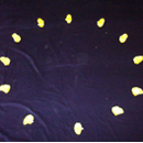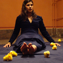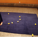 Die Europäische Union wächst und mit ihr die Herausforderung an den Zusammenhalt. Die Künstlerin versammelt 27 gelbe Aufzieh-Küken als Symbole für die 27 Mitglieder der Europaischen Union um sich auf einen blauen Untergrund. Sie sitzt in der Mitte dieser europäischen Flagge und beobachtet, wie sich einige Küken aus der Reihe bewegen und drohen fortzulaufen.