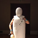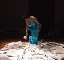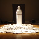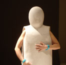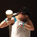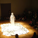 Mit ihrer Performance "Blind" nimmt Nezaket Ekici Bezug auf das 1923 entstandene Gemälde "Heilige Cäcilie- Das unsichtbare Klavier" von Max Ernst (Staatsgalerie Stuttgart /Sammlung). Der Legende nach erlitt Cäcilie im 5. Jahrhundert in Rom ein großsamen Märtyrium. Die bedrängende Ummauerung in der die Heilige in Ernsts Gemälde eingeschlossen erscheint, stellt das seltene Motiv des Caldariums - eine Hitzekammer - dar, in der sie erstickt oder verbrennen sollte. Doch sie überlebte Kraft ihres Glaubens und brach die Mauern auf. Vergleichbar "eingemauert" zeigt sich auch Nezaket Ekici in ihrer Performance. Außer den seitlich herausragenden nackten Armen sind Kopf und Körper vollkommen von einem dickwandigen Gipsmantel umschlossen. In den Händen hält sie Hammer und Meißel. Blind sucht sie sich im Verlauf der Performance aus der extremen Enge herauszuarbeiten, sich im wortwörtlichen Sinne aus dem selbst auferlegtem Märtyrium herauszuschlagen. Versetzt in das Heute von Glaubens-, Identitäts- und Lebenskrisen, scheint die Legende nunmehr allgemein gefasstes Sinnbild des eigenen oftmals verzweifelten Ringens um sich selbst- um den eigenen Raum, um die eigene Wahrheit jeder mißglückte aber auch gelungene Schlag gerät zum Zeichen einer in der Ambivalanz von Scheitern und Erfolg geprägten schmerzhaften Annäherung an das eigene Ich. Im Gemälde von Max Ernst tastet Cäcilie nach einem unsichtbaren Klavier - Sinnbild himmlischen Orgeltöne, die sich während ihres Märtyriums gehört haben soll. Bei Nezaket Ekici ertönt allein Befreiung versprechende Klang des Meißels (Text: Rita Täuber).