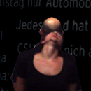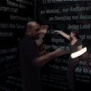 Die PerformanceInstallation "In München, Um München, Um München herum" arbeitet mit Zitaten der Menschen, die in München und Umgebung leben und bringt sie in veränderter Form in den Ausstellungsraum. Der Betrachter befindet sich im dunklen Raum. Die Künstler Nezaket Ekici und Professor T. Melih Görgün drehen sich zeitgleich Rücken an Rücken im dunklen Raum um die eigene Achse, nur zwei Lichtquellen zielen Richtung Wand und beleuchten der Zitate ausschnitthaft. So werden bestimmte Zitate für den Augenblick präsent. Das Gesamtbild ist vergleichbar mit einem Sternbild am Firmament. Nur einzelne Punkte leuchten auf und lassen das Ganze erahnen. Der Raum ist nicht fassbar, nur die Lichtpunkte geben eine Richtung vor. Der Betrachter erfährt auch die körperliche Präsenz der Performer, die durch das ständige Drehen um die eigene Achse angestrengt sind.
