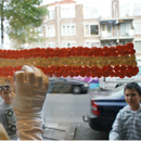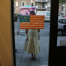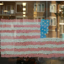Die Grenzen von Nationalstaaten entstehen typischer Weise in unseren Köpfen und sedimentieren in vielerlei Formen, wie in der Nationalhymne oder auf der Flagge als Symbol. Die Künstlerin beschreibt mit der amerikanischen Flagge ein Phänomen, dass die Kultur und Lebensart großer Teile der Menschheit in den letzten 150 Jahren geprägt hat. Das geht soweit, dass die amerikanische Flagge als Instrument der Grenzsetzung sogar auf den Mond gebracht wurde (1969) und dort als sichtbares Zeichen besteht. Kaugummi kauen ist zudem seit der Industrialisierung in den USA als Markenzeichen bekannt. Auf ironische Weise spielt die Künstlerin mit der Grenze in unseren Köpfen, indem Sie Kaugummi kauen, Grenze und das Symbol der nationalen Einheit zusammenbringt. Der Betrachter kann dabei mitverfolgen, wie die Flagge aus Kaugummi auf dem Glas entsteht und sich als Grenzsetzung langsam in unser Bewusstsein einzeichnet.