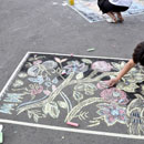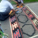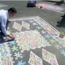 50 Packungen bunte Kreide (Rot, Gelb, Weiß, Schwarz, Dunkelblau, Hellblau, Braun, Cream, Grün, Dunkelgrün), 100 T-shirts mit Aufdruck, Klebebänder, 4 Helfer, Orienteppichmuster als Vorlage, ein Tisch Papier