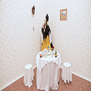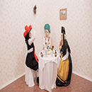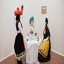 In her video performance "Kaffeeklatsch", Ekici refers to the German ritual of "coffee and cake". Between 3 p.m. and 5 p.m., many German families take time to meet and share: they drink coffee together, eat cake and talk. For many people, the coffee time is like a ritual in which they surprise each other with refined cakes and have good conversations in a relaxed atmosphere (German Gemütlichkeit). If you look into the history of coffee gossip, you can quickly see that coffee gossip in the 16th and 17th centuries was a counter-movement to the men's world with the emergence of the bourgeoisie. The "Kränzchen" (coffee circle), as it was also called, served the women to exchange among themselves and thus enjoy a piece of freedom that until then had been reserved for men in social circles. In a sense, the Kaffeeklatsch can thus be regarded as the beginning of the women's equal rights movement. The artist Nezaket Ekici plays with this image of the coffee gossip and transfers it to herself as a migrant, grown up in Germany; combining it with her question as an integrated German about belonging to German society. She wonders what her own German tradition is - which leads to the general question of what German tradition actually is. In order to answer these questions, Ekici has dealt with traditional German costumes (Trachten) and staged herself. In the video performance, for example, one sees 3women at a table performed by Ekici herself, a woman in Black Forest costume, a woman in Spreewald costume and a woman in Thuringian costume. The three costumes stand for the south, north and middle of Germany. It is all about articulation, gestures and facial.