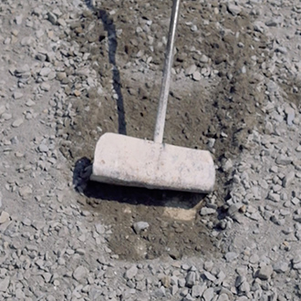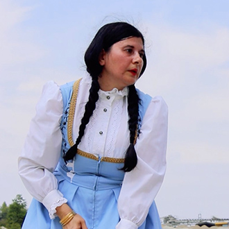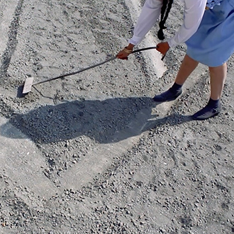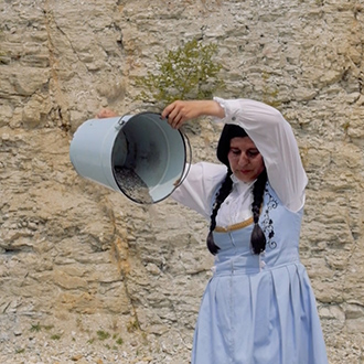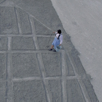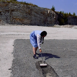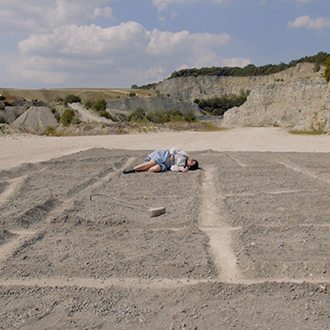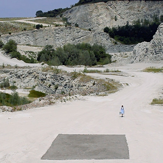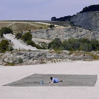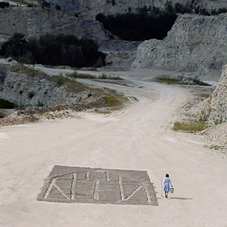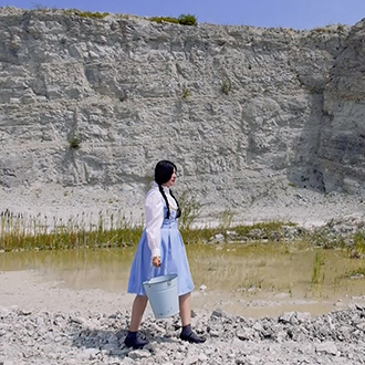 Wearing a blue and white Dirndl dress, a traditional form of woman’s clothes in Germany, Nezaket Ekici walks down an empty stone quarry carrying a hoe and a bucket. The camera shifts angles, showing us the precarious nature of the place she is in: large broken rocks crowd the road, her short kitten heels fumble and stride uneasily over the craggy path. Changing once more to an aerial view, the audience is shown the entire landscape and the overwhelming size of the quarry is revealed, as well as the immense 100sqm black square of gravel Ekici slowly moves towards.