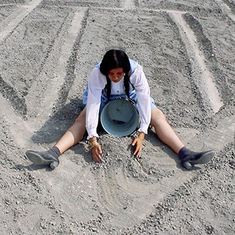 Over the course of many hours, “My German Tradition” documents Ekici working by herself to transform the black square of gravel (reminiscent of Kasimir Malewitsch’s own “Black Square” (from 1915) painting, an icon of modern art and considered the beginning of non-objective painting. Malevich’s piece marks the transition to abstraction by depicting the pure form of the square on a white background. To this context, Ekici brings the traditional German Fachwerkhaus. Infusing the tradition of her German costume and architecture with the abstract geometric “Black Square,” Ekici’s performance, which takes place in a stone quarry where modern technological machines craft nature into buildings, supports an augmented view of modernity as an extension of nature and past.