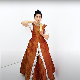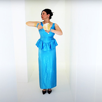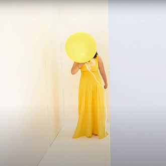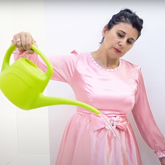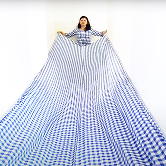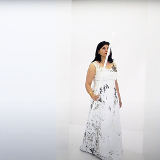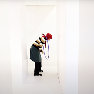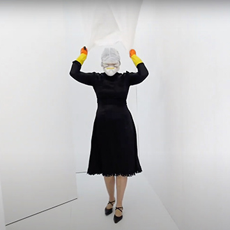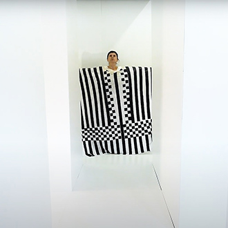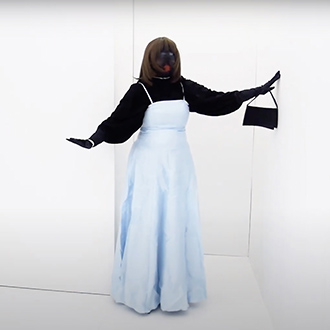 Nezaket Ekici enters the camera’s view dressed in a long white, draping costume, hoisting a white flag. This costume is from her 2017 performance “83 Nationen Schmallenberg”. As the video continues, over 50 costumes from the 300 different performances and installations of Nezaket’s oeuvre are worn; each time Ekici emerges from a different part of the maze, often surprising the viewer with a dance or action derived from the costume’s original performance.