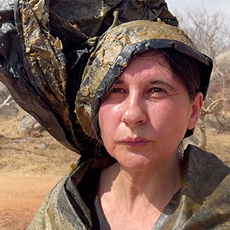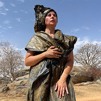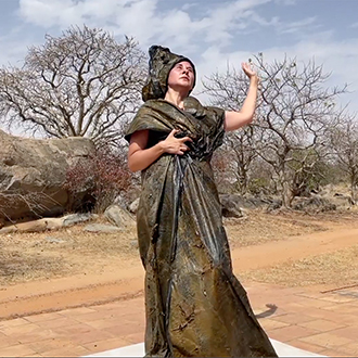 In “Wax Alive” (2022) Ekici synthesizes her interest in the ancient artistry of bronze casting with a live performance that reimagines the notions of materiality through body and nature. Wrapped in a plastic dress covered in wax, Ekici stands on a white platform in the scorching Burkina Faso sun. She inhabits the place of a real bronze cast: under the unrelenting glare and blaze of nature she stands, the wax slowly melting from her dress. These droplets fall with stochastic effect onto the white platform, creating an abstract work. After two hours, Ekici ends the performance: her face has gained a deep red shade. She is utterly enervated by the heat and light. She leaves the platform and takes off her costume. The platform, now covered with solidified wax drops, becomes a work of art in its own right—a tribute to Jackson Pollock and his drip painting technique.
