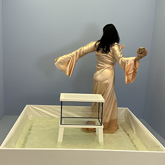 Illusion begins in a pale blue room reminiscent of an azure sky and sea. Nezaket can be seen leaned over, hair billowing in the wind, body clothed by a salmon satin costume. She stands in a man-made pool of water, with an empty aquarium container exhibited in the center. On the grated wood roof of the aquarium lies a large sandstone. She straightens up, still swaying, lifting a small block of stone over her head. Over the course of many hours, this single sandstone rock will be used by her to grind down the larger stone; and she will attempt to fill the aquarium with its sand. The curiosities of Illusion lie in the fundamental question of creation. How is sand made? Who makes it? What is an ocean, a sea? Can the artist create something truly and entirely natural? With her hands, Ekici begins a long and arduous task of testing this process of creation. She shows the real power of the physical body by almost stressing it to its limit. In this physical exertion, one wonders what the artist needs to create ‘sand’—a material produced by the natural geological changes of the plant over millions of years. Here, a human attempts that form of creation, highlighting how a human subject may take-on almost God-like, supernatural tasks. Artificially made sounds of the ocean—waves, wind, birds, thunder—esconce the performance in a pelagic atmosphere. But we are nevertheless distinctly aware that this performance takes place in a contained box. In order to make the task easier, Ekici requires the ocean’s help. She has to use water to wet the stone and weaken its surfaces. As the bottom of the aquarium slowly fills with sand, we notice that the artist is creating another smaller beach which reflects our natural world: except in miniature. This moment is completed by Ekici’s submersion into this mimetic universe: Ekici lies down in the water, as she would in the sea, her pink satin costume floating to the top, her calm face hovering. In covering herself, she subsumes herself and dives under the waves, to enter her creation even though she is its creator. The rocks placed on her chest both weigh her down, keeping her in the water, and look like oversized jewelry pieces, highlighting the artifice she wears on her body like clothes. By the end of the performance, the water itself has become yellow and muddy—the sand she has made has leaked into it, the dust of nature fusing with the artificial world she has created. (Text Jono Wang Chu)