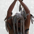 When the artist comes back from the Water, the public is asked to cut the fisch from her body and put on plates. Afterwords everyone is invited to eat the grilled salted fish.