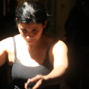 The first part of performance: 9 guests write their names on an overhead projector. The artist spells out the name by German alphabet and jumps to rope. Having spelled a name, this guest sits at the table until all guests are seated.