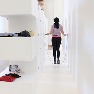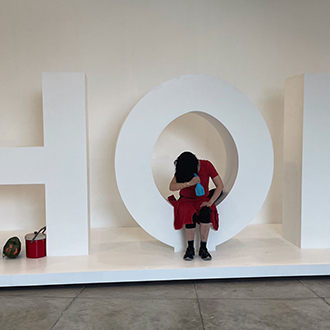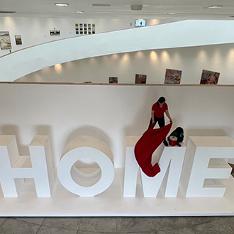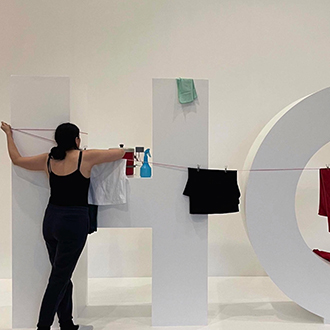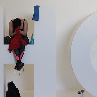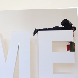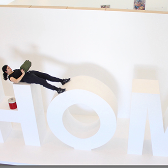 In “Zero Point,” Nezaket Ekici explores the meaning of home and place, questioning how one’s sense of belonging is both created and maintained. Presented as a performance installation at the Bangkok Art & Culture Centre (BACC), Ekici set up large, 2.5 meter tall block letter and 10 meter long installation which spelled out “HOME”. For a week for 8 hours a day, she set out attempting to live her life with only a backpack (where all her materials like clothes, book, water, soap, skipping rope, sleeping bag were kept), and food bucket. She walked, ate, slept, washed, and exercised for 8 hours within these 8 letters. Remnants of Ekici’s daily life are scattered throughout: a water bottle half-finished, clothes neatly folded, cleaning supplies, even a sleeping bag transformed into a weight. As the crushing sense of boredom sets in, Ekici displays a life that attempts vigorously to fight against it—she skips rope, cleans, eats, and moves with agility between the tall letters.