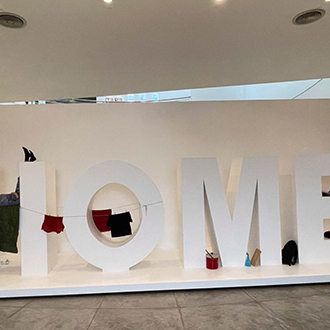 Ekici attempts to live within this word “HOME”—literally, physically, symbolically. She lies across the letters, balances between them, stores food, hangs laundry, exercises, and rests. Yet the performance makes clear: these letters may spell a destination and they may constitute a signified place, but they cannot offer shelter. They cannot satisfy that homeward feeling of “Sehnsucht”.