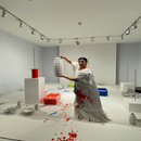 White pedestals are spread out in an entirely white room. On the floor lies objects made of porcelain and buckets filled with different colors. Picking up each object individually, Ekici dips each one in one of the 5 colors: red, blue, black gold, green. She then piles the objects on the pedestals according to the color they belong to. In the process of creating “Panta Rhei”, Ekici fills the previously white floor with color: the porcelain objects drip onto the floor, the pedestals themselves, and Ekici’s costume, where they merge with each other and create beautiful smeared ‘tie-dye’ adjacent mixtures. The more porcelain she piles on top of each other, the taller the resulting abstract, colorful sculptures become. Through her work, Ekici raises questions about the practice of collecting and how collections themselves are meaningfully formed. How do collections develop? What categorizations are found and invented for objects? What is the labor and pain behind collecting and letting go? The performance installation is part of the anniversary exhibition "Bröhan Total!”. (Text Edited: Jono Wang Chu)